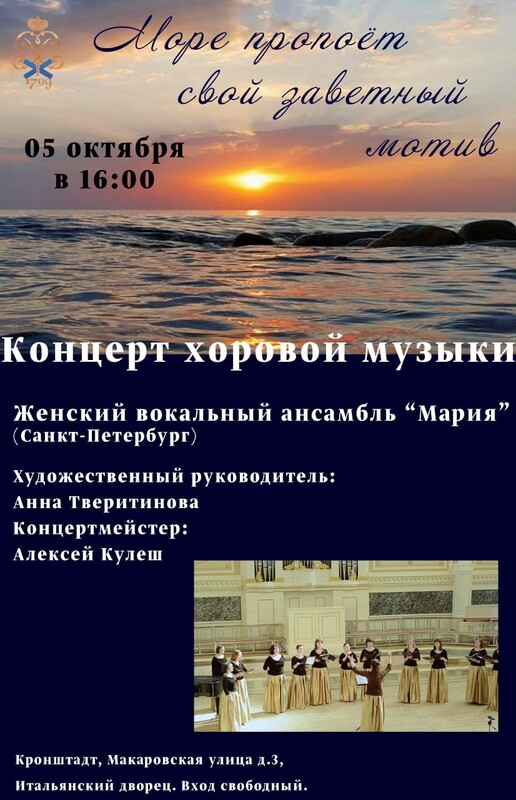 После церемонии открытия, в 16 часов, гостей ждет музыкальный подарок – концерт «Море пропоет свой заветный мотив» академического женского вокального ансамбля «Мария» (Санкт-Петербург). Этот прославленный коллектив, основанный в 1990 году заслуженным работником культуры РСФСР Ириной Смирновой, является лауреатом международных конкурсов и хранителем традиций классического хорового искусства. С 2008 года ансамблем руководит Анна Тверитинова, концертмейстер – Алексей Кулеш. В программе прозвучат произведения, посвященные морской стихии и России.