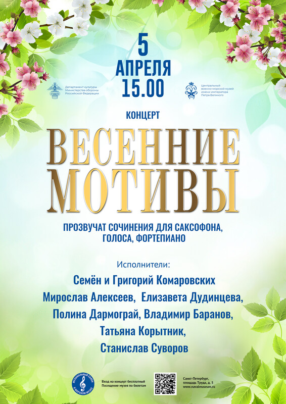 5 апреля в 15 часов в рамках проекта "Музыкальный салон в Морском музее" приглашаем вас на концерт «Весенние мотивы», в котором прозвучат сочинения для саксофона, голоса и фортепиано..