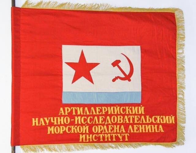 На фото: экспонат ЦВММ: Знамя красное Артиллерийского научно-исследовательского морского ордена Ленина института ВМФ.1950-е гг. Номер в Госкаталоге: 44112770.