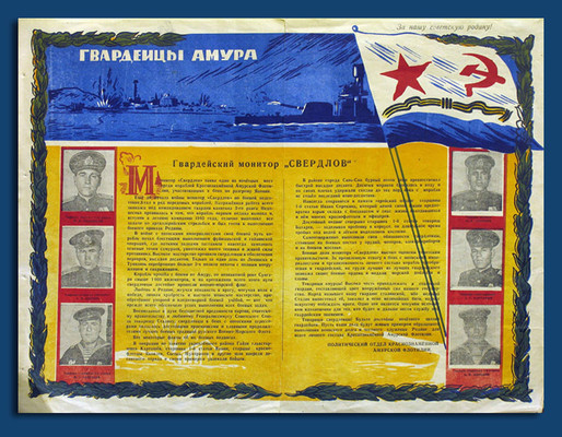 На фото: экспонат ЦВММ: Листовка "Гвардейцы Амура. Гвардейский монитор "Свердлов". Политотдел Краснознаменной Амурской флотилии.