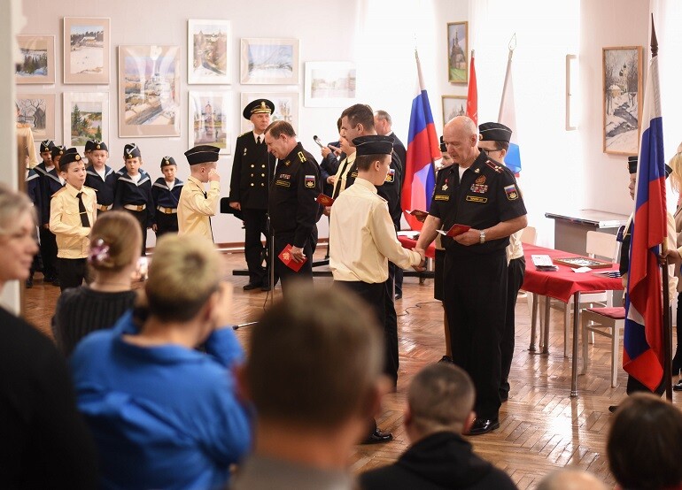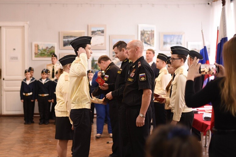 Новоиспеченным кадетам были торжественно вручены удостоверения и шевроны, юнгам - значки.