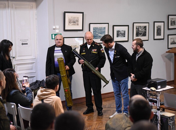 Присутствовавшие на кинопаказе участники СВО передали предметы из зоны боевых действий в дар музею.