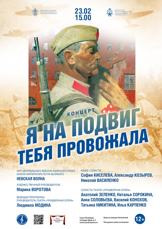 В этот день в главном здании музея на площади Труда пройдет праздничный концерт "Я на подвиг тебя провожала" в исполнении музейных коллективов "Придворная опера" и «Невская волна» (в 15 часов), а накануне, 21 февраля концерт «Вам, защитники Отечества» пройдет в Итальянском дворце Кронштадта (в 15 часов) и 22 февраля, здесь же, в филиале "Кронштадтская крепость" откроется выставка моряка-художника "Глубина".